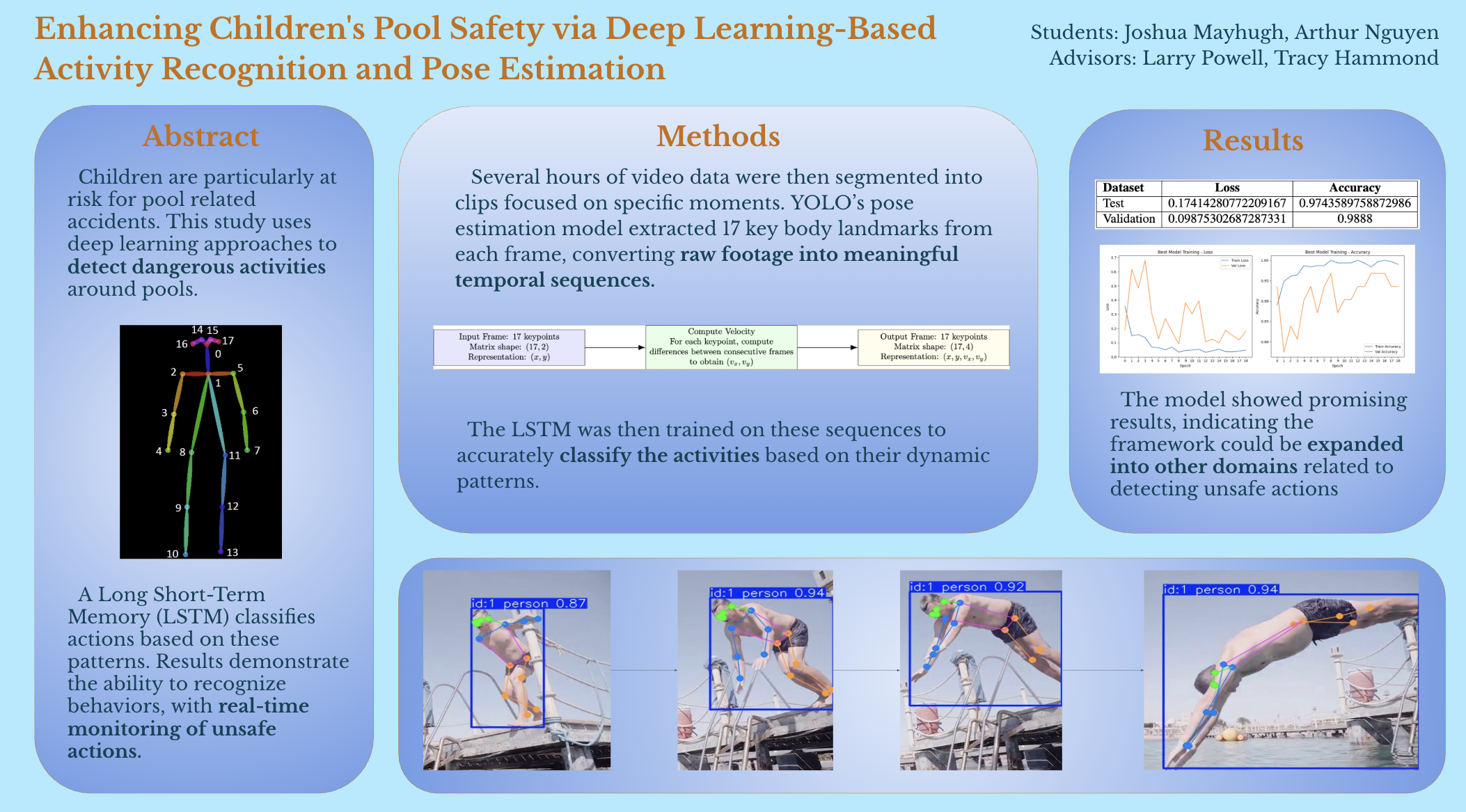 I conducted research on the possibility of using real time computer vision to identify dangerous actions in a pool setting and to benefit swimming education. To do this, I filtered and cleaned a large dataset of videos of swimmers in order to classify swimmer actions and applied long short-term memory model and pose estimation to obtain a 96% accuracy in identifying swimmer actions. This functionality received the 1st Place Award for Best Computer Science Research Poster at Texas A&M's Student Research Week.